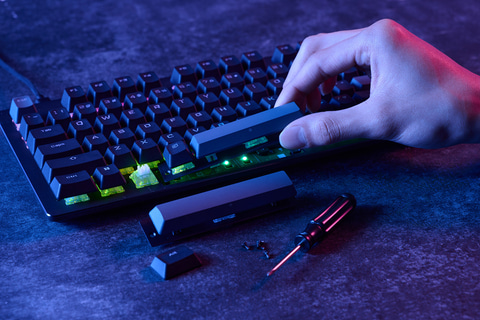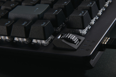 本体右上にはプログラマブルダイヤルを装備。Escキーやファンクションキーと組み合わせることで、音量調整などが行なえる。各キーには1,677万色のRGB LEDライティング機能を搭載する。