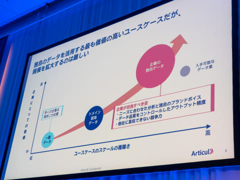 「汎用的な知識を持つモデルは必要ですが、それだけでは十分ではありません。いわば氷山の一角であり、水面下にあるものも気にかけなくてはならないでしょう。企業目線で述べるならば、モデルがデータセットによって学べる内容は、いわば『高校生』レベルと言っていいでしょう。どのような業種であれ、業務レベルでAIを活用するのであれば、それは多少なりとも事業ドメインについての知識がある『大学生』レベルであるべきです。