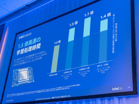 AI Everywhereを実現するプロセスとしては「学習処理」、「ファインチューニング」、「実装」、「推論」の4つを挙げている。このうち学習処理を担うAIアクセラレーターとしてはGaudi 3を紹介。「AIの学習処理と推論に特化し、NVIDIA GPUを上回る性能を提供する」と性能をアピールした。