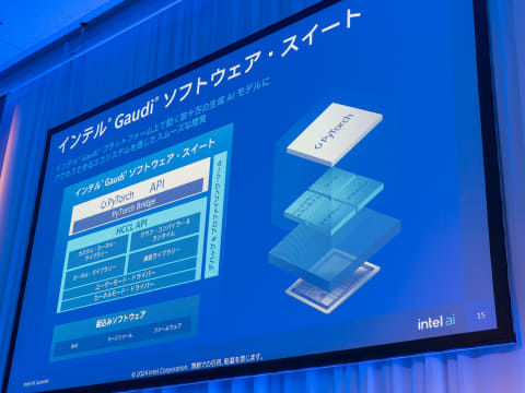 このほかインテルが用意している開発環境についても言及。「Tiberデベロッパー・クラウド」ではGaudi 2からGaudi 3へシームレスにコードを移植できる利便性をアピールし、提供中の「Gaudiソフトウェア・スイート」についてはPyTorchやTensorFlowを用いた抽象度の高いフレームワークをサポートしている点を重要な特徴の1つとして紹介した。