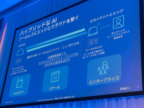 AI PCについては「ハイブリッドなAIとして、クラウドとエッジをシームレスに繋ぐというのがAI PCの基本的な構成」と概要を説明。ここでは大規模なAIはクラウド、小規模なLLMの推論はローカルで処理するのが効率的とし、ユーザーは個人のデータをクラウドに出すことなく、安全にAIの恩恵が得られると話した。