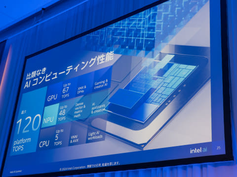 また、AI向けクライアント製品に関しては、第3四半期出荷予定の「Lunar Lake」、第4四半期出荷予定の「Arrow Lake」を紹介。このうち薄型ノートPC向けとなるLunar LakeについてはNPU性能について言及。NPU単体でMicrosoft Copilotの動作要件となる40TOPSを上回る48TOPSを実現し、CPUとGPUの処理を合わせるとプロセッサ全体で120TOPSのAI処理性能を備える点をアピールした。