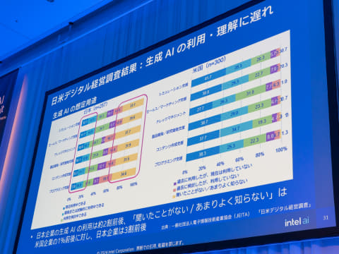 続いて鈴木氏は、企業における生成AIの利用/理解に関する日米間の差異に関する調査結果を提示し、日本側の課題について話した。調査では、米国に比べて日本企業は生成AIの利用が少ない傾向にあるとされる。ただ鈴木氏によると、直近でこの状況は急激に変化しているという。