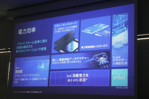 ちなみにLunar Lakeでは上記のCPU/GPU/NPUの強化のほかに、メモリコントローラに近いところに8MBの「メモリー・サイド・キャッシュ」を統合した点も見逃せない。たとえばNPUで1回アクセスしたデータをCPUもアクセスする場合などは、このメモリー・サイド・キャッシュを参照すれば効率よくなるため、性能が向上するとのことだった。