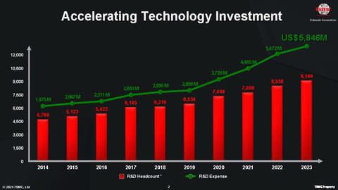 「現在AIによって演算性能に対するニーズは文字通り爆発的に増えている。たとえば弊社の顧客であるNVIDIAを例にとってみると、V100ではFP16で130TFLOPSだった性能は、H100ではFP8で4,000TFLOPSになり、さらに今年発表されたBlackwellではFP4で2万TFLOPSになっている。そしてトランジスタ数もV100では210億トランジスタだったのが、2,080億トランジスタへと10倍近くになっている」と述べ、新しいアプリケーションの登場が、演算能力への要求を引き上げる一方で、それを実現する半導体のプロセスノードと後工程(チップレットなど)の進化が重要になっていると説明した。このためTSMCの半導体研究者は年々増えており、2023年で9,149名、研究開発に利用したコストは58億4,600万ドルへと増大傾向にあるという。