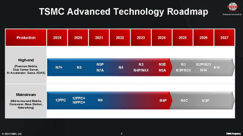 プロセスノードへの進化という意味では、3nm(N3ノード)をはじめとした各プロセスノードの開発が順調に推移しているという。N3は昨年(2023年)中に既に量産が開始されており、現在はバリエーションになるN3E、N3P、N3Xなどの開発が進められており、今年にN3Eの量産が開始される計画になっている。