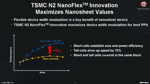 そして2025年には2nm(N2)の投入が行なわれ、N2ではNanoFlexと呼ばれる、GAA(Gate All Around)という4D形状のFETの構成を調整する技術が投入される。それによりPPA(面積および電力あたりの性能の略)と呼ばれる、ダイサイズや性能、電力などを最適化することを可能にする。
