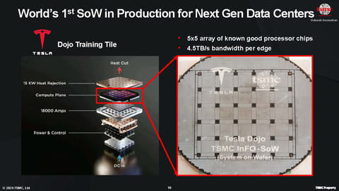 既に、自動車メーカーTESLAが試作した「Dojo」というAI学習用のチップでは、ウェハ上に5x5(つまり25個)のチップを構築することが可能になっているという。