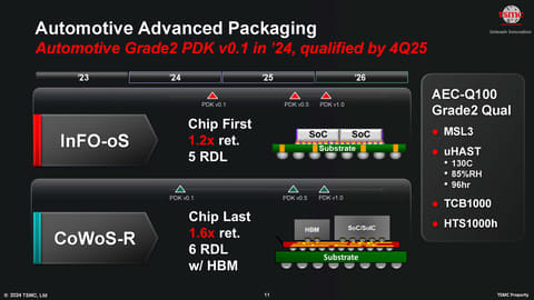 また、自動車グレードに対応したチップレット技術として「InFO-oS」と「CoWoS-R」を説明し、3nmなどの最先端のプロセスノードを利用して強力なチップを構築する環境が整っていると説明。日本に集中している自動車メーカーやティアワンの部品メーカーなどに採用を呼びかけた。