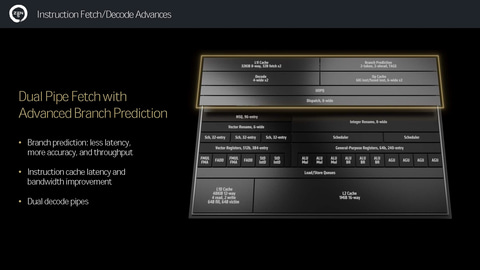 これらの強化により分岐予測の低遅延、正確性の向上、スループットの向上などが実現され、実行ユニットに命令を引き渡すディスパッチも1クロックサイクルでZen 4の6内部命令から8内部命令に引き上げられている。