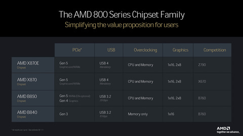 AMD 800のSKUは4つ用意されており、X870E、X870、B850、B840となる。従来のB650、A620、A620Aの3つのローエンドSKUが整理され、B840へと統合されることが特徴だ。
