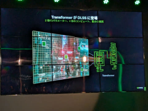 ゲームプレイ時にフレームレートを向上させる「DLSS」についても最新バージョンの「DLSS 4」に進化。出力解像度を下げ、AIを活用したアップスケーリングを内部で行なうことで、パフォーマンスを向上させていたが、この基本モデルを更新。DLSS 3で使用していた「CNN(畳み込みニューラルネットワーク)」モデルから「Transformer」モデルに置き換えたことで、4倍の演算能力を実現、さらなる画質の向上を果たしている。