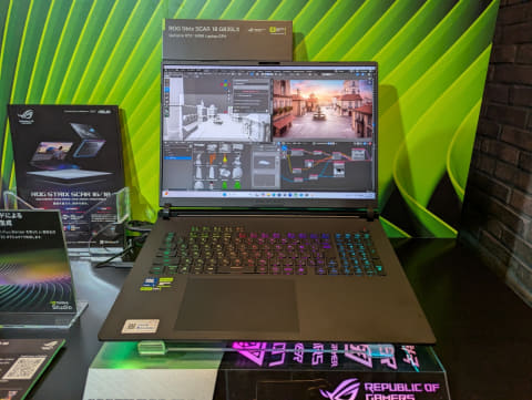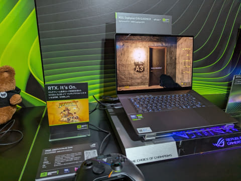 展示された最新のゲーミングノートPCではゲームを動作させ、「DLSS 4」によるパフォーマンスの高さを示したり、AIを活用した動画編集や映像配信のアプリを用いたデモを展示しており、実際に手に触れて操作したり、ゲームをプレイすることなどで、その性能を体感できた。