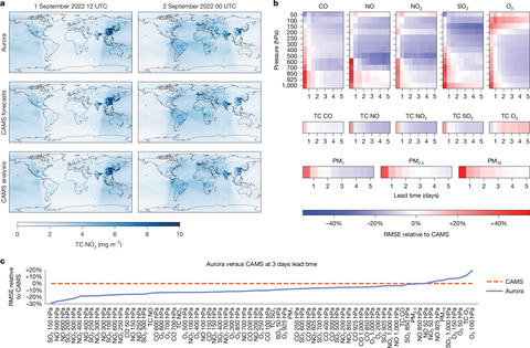 大気化学と大気汚染の予測についても、Auroraはコペルニクス大気モニタリングサービス(CAMS)の予測と比較して、多くの項目で同等またはそれ以上の性能を示した。事例として、2022年6月13日にイラクで発生した大規模な砂嵐を発生1日前に正確に予測した。