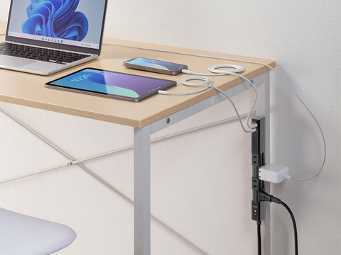 安全面では、雷ガードや絶縁キャップ付きスイングプラグ、断線しにくい二重被覆コードなど複数の対策を施している。強力なネオジムマグネットが付属し、デスクの脚やスチール面に固定可能。また、ネジ穴も備え、壁への仮固定もできる。