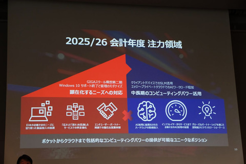 2025年度については、まず前半はWindows 10のサポート終了(EoS)や、GIGAスクール構想第2期に向けて高まる需要への対応に注力する。日本のPC市場は世界的に見ても安定しており、約1,200万台のPCが毎年出荷されているが、今年度の前半はEoSやGIGAによりさらなる需要が見込まれる。同社ではユーザーの動向を見ながら、積極的な出荷増を狙っていくとした。