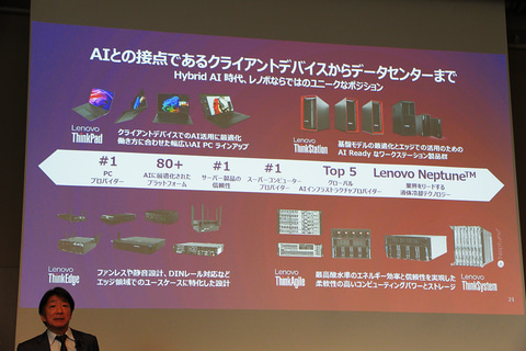 また、レノボグループではスマートフォンやPC、クラウド、データセンターなど「ポケットからクラウドまで」をカバーする幅広い製品群を所有している。この点は、さまざまな場所にAIが拡がっていくHybrid AI時代をサポートしていく中で強みになると説明した。
