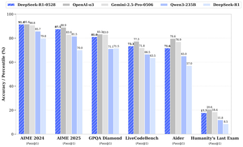 従来バージョンと比べ、計算リソースの増強やポストトレーニングにおけるアルゴリズム最適化メカニズムの導入などにより、推論の深さや推論能力を大幅に向上。AIME 2025を使ったテストで精度が70%から87.5%に改善するなど、OpenAI-o3やGemini-2.5-Pro-0506に迫る性能を実現したという。