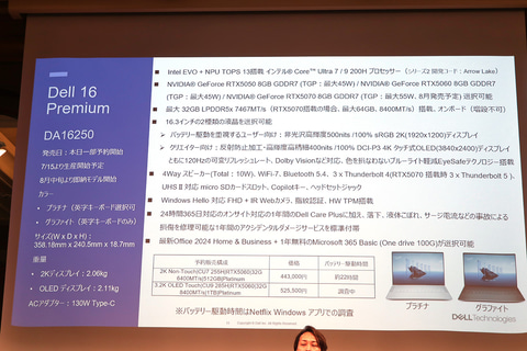 Dell 16 Premium(DA16250)は16.3型ディスプレイを搭載した上位モデルで、GeForce RTX 5050(45W)/5060(45W)/5070(55W) Laptop GPUを標準で搭載し、CPU内蔵GPUモデルは存在しない。6月26日より一部構成を予約開始し、7月より生産開始し、8月中旬より出荷する。
