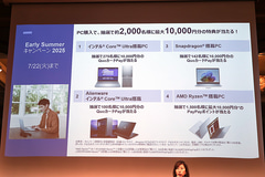 現在「Early Summerキャンペーン 2025」を開催しており、抽選で約2,000名に最大1万円分の特典が当たるキャンペーンを実施中。具体的にはCore Ultra搭載PC、Snapdragon搭載PC、Core Ultra搭載Alienwareの購入では1万円分のQuoカード、Ryzen搭載PC購入で最大1万円のPayPayポイントがプレゼントされる。