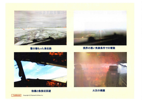 たとえば、氷が張った状態の滑走路で離着陸し、その映像を映し出しながら、ブレーキやステアリングが効きにくい状況も体験できるなど、過酷な飛行条件下の訓練もできる。スカイマークが就航していない伊丹空港の映像を表示し、インシデントが発生したことを想定した着陸シミュレーションなども行なえる。