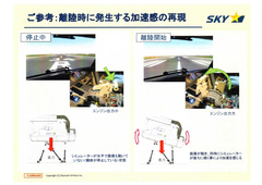 操縦操作によってエンジン出力を高め、機体が動き出すと、画像も動き出し、同時にモーションジャッキが動き、機体が後ろに傾くことで加速を感じることができる。