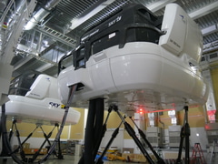 スカイマーク運航本部訓練審査部SIM管理課課長の田沼潔氏は、「天井部分に3台のプロジェクタを設置し、CGによる映像を、半透明スクリーンの裏側から投影。この映像を球面ミラーに反射させて、パイロットはそれを見ることで、臨場感のある環境で訓練などができる。球面ミラーは、薄いアルミ箔によって構成され、それを後ろ側から空気を吸引して凸面鏡を作って映し出す。ひずみがなく、遠いところと近いところの遠近感がある映像を投影できる」という。