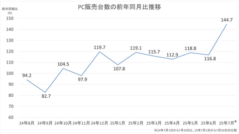 個人向けPCも7月は前年同月比44.7%増。EoSに向けた買い替え需要が本格化