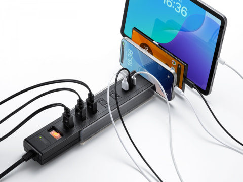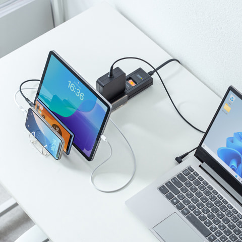 TAP-B47UCシリーズは、本体に内蔵されたスライド式のスタンドを引き出すことで、スマートフォンやタブレットを最大3台まで立て掛けて設置できる電源タップ。デスク周りの限られたスペースを有効活用し、複数のデバイスをすっきりと管理できる。