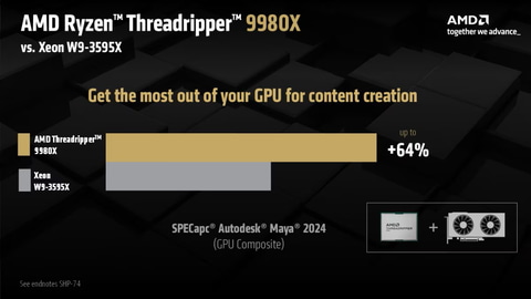 同社によれば、競合のXeon W-3500と比較してCinebench 2024は最大83%、Adobe After Effects性能は最大80%向上するという。また、Ryzen Threadripper 9980Xは、同じビデオカードを使用したXeon w9-3595X環境と比較して、Autodsk Mayaで最大64%高いGPU性能を実現するとしている。