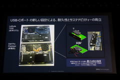 続いてサスティナビリティへの取り組みの一環として、ネジ止めでコネクタ部だけ交換できるUSB Type-Cポートの全面採用を挙げた。USB Type-Cは利便性が高いコネクタだが、挿抜の機会が多いだけに故障しやすい。デルの設計では、万が一コネクタが故障したとしてもその部分だけ換装できるので、ユーザーの負担が少なく、デル側にとっても修理しやすい。さらにそして無駄になる部品を生まず、サスティナブルであるとした。