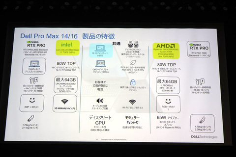 「Dell Pro Max 14」および「Dell Pro Max 16」は、CPUにCore Ultra 200HシリーズまたはRyzen AIシリーズが選べるノートPC。Ryzen AI選択時はCopilot+ PCに準拠する。