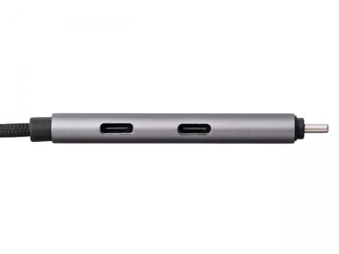 ハブはUSB Type-Cポートを2基備えており、コネクタ側はUSB 3.2 Gen 1、ケーブル側はUSB 2.0となっている。ケーブル部分は最大92Wの給電に対応する。