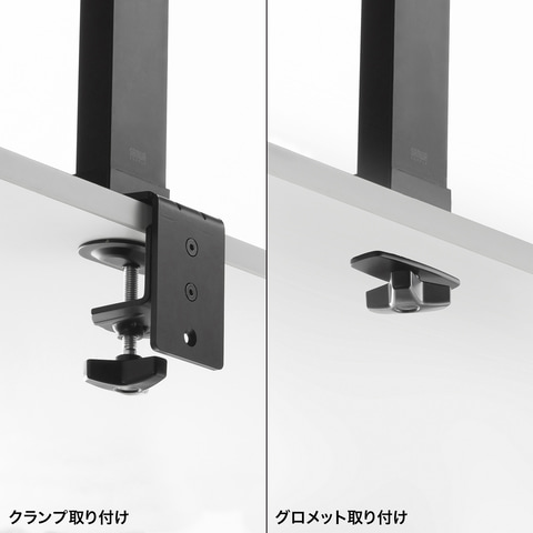 デスクへの固定方法は、天板を挟むクランプ式と、デスクに設けた穴を利用するグロメット式の2種類。設置可能な天板の厚さは、クランプ式の場合で10~85mm、グロメット式の場合で10~40mm。