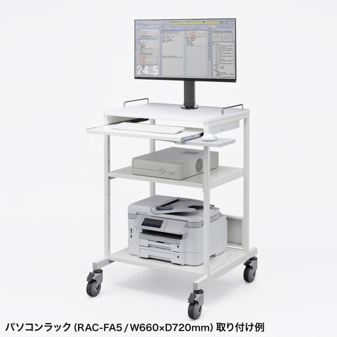 CR-LAC101BKは省スペースに設置できるモニタースタンド。アームがないタイプのため、奥行きの短いデスクや、壁際にモニターを寄せて設置したい場合などに適している。キャスター付きのパソコンラックに取り付けて、モニターごと移動させるといった使い方もできる。