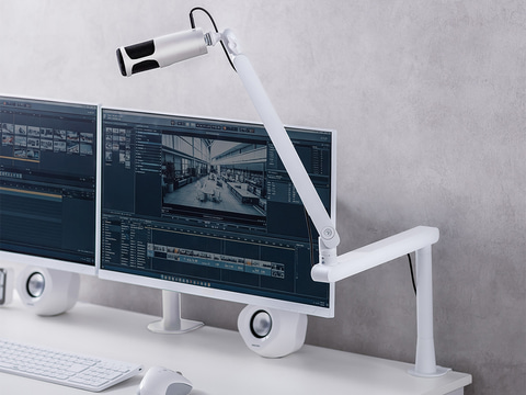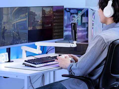 100-MCST001Wは、2kgまでのマイクを搭載できるマイクアーム。ロープロファイル対応により、11cmの高さからアームを水平に出して使用可能で、限られたスペースでも効率的に配置できる。