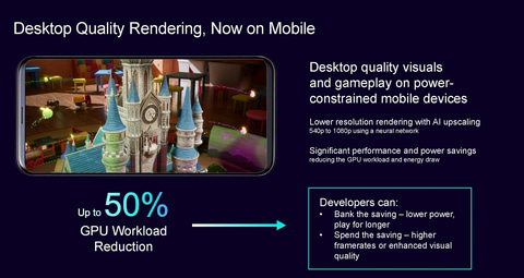 また、Armは既に超解像技術「Arm ASR」(Arm Accuracy Super Resolution)」の開発意向表明を行なっているが、今回はAIアクセラレータの機能を利用した「Arm NSS」(Arm Neural Super Sampling)の開発意向表明も行ない、GPUのレンダリングエンジンへの負荷を最大50%減らしながら、より高品質なゲーム描画などをモバイル機器でも可能にする計画だ。