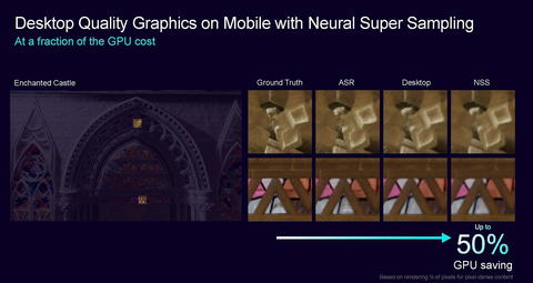 Armは今年前半にArm ASRと同社が呼んでいる超解像技術を将来のGPUに搭載する開発意向表明を行なっている。今回、AIアクセラレータの2026年製品採用GPUに内蔵されると明らかにしたことに合わせて、その機能を利用したArm NSSの開発意向が示された。