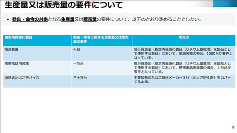その上で、レアメタルを含む小型リチウムバッテリの回収量拡大(資源性)、リサイクルや廃棄物処理における発煙/発火リスクの低減(安全性)、リチウムバッテリ一体型製品の回収体制強化といった観点から、上述の3品目を指定再資源化製品に追加指定すべきだと説明した。勧告/命令の対象となる生産量または販売量については、以下のように定めるという。