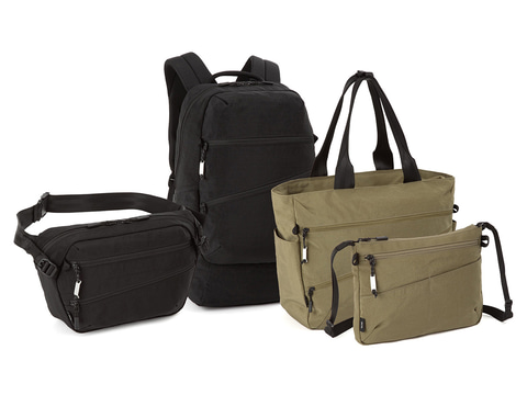 各製品ともに、ワッシャー加工のナイロン生地を採用した軽量設計のバッグ。撥水/撥油性に優れたテフロン加工を施している。また、トートやリュックでは、13.3型ノートPCが入るPC収納スペース、スーツケースに固定できるセットアップベルトなども備える。