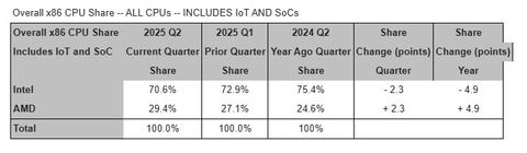 ゲーミングコンソールなどに使用されるIoTやセミカスタム製品も含むシェアでは、AMDのゲーミング向けSoCの大幅な出荷増がシェアの動きを決定づけた。2024年はコンソールの在庫過多によりAMDのSoC出荷数が減少していたものの、2025年で回復。AMDによれば第2四半期のゲーミングセグメント収益(PC向けグラフィックス製品を含む)は前期比73%増加しているといい、Mercury ResearchはAMD製ゲーミング向けCPUの出荷はさらに高い成長率だと推定している。これにより、IoT/SoCを含むx86系CPU全体でのシェアはAMDが前期比2.3ポイント増、前年比4.9ポイント増の29.4%を獲得している。