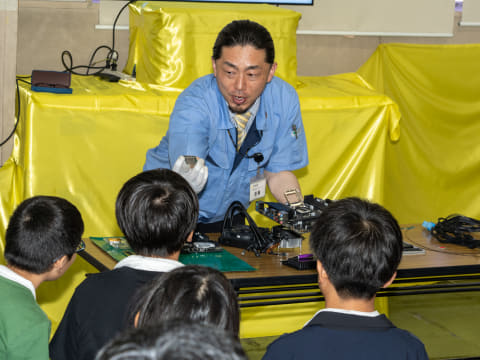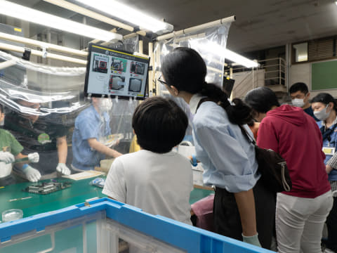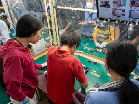 組み立て工程に入ると、参加者に割り振られた作業台で各自集中して組み立て作業を行なう。作業台のモニターには組み込むパーツや組み込み手順を記載した指示書が映し出されており、児童は時折不明点を先生に確認しつつ、組み立て作業を進めていた。