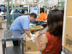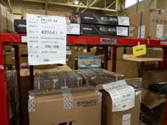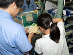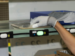マザーボードやビデオカードなど大きなパーツは集めるのも簡単だが、取扱説明書や保証書、ステッカーの類は細かく分類されており、専用のエリアが用意されている。ここでは取り違えがないように、工場内に備え付けのリーダーで地図に印刷されたバーコードを読み取って、ランプが点灯した棚から書類を取り出す仕組みになっていた。