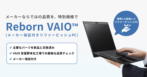 Reborn VAIOは、法人などで使用されたVAIO製品をVAIO自身が買い取り、厳格な基準で修理・整備した上で再生したPCとなる。VAIOは2023年8月に個人向けに「認定整備済PC事業」を立ち上げているが、今回「Reborn VAIO」に改称するとともに、法人向けへの提供を開始することになった。