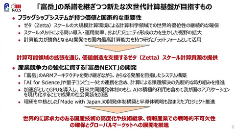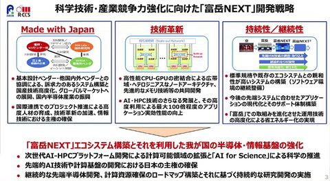 CPUやGPUを購入して搭載するのではなく、富士通およびNVIDIAとともに、世界最高のAI時代のCPUおよびGPUを設計し、理研とともに、世界最高のスーパーコンピュータシステム、ソフトウェア、アプリケーションを作ることになる。富岳NEXTに留まらず、世界のスーパーコンピュータにも活用され、標準規格となり、普及していくことも目指す。半導体のリーダーシップも築いていく。ARMアーキテクチャを受け継ぎながら、さらなる発展を目指したシステムを構築し、富岳の系譜を継ぎつつ、新たな次世代計算基盤を目指すことになる」と位置づけた。