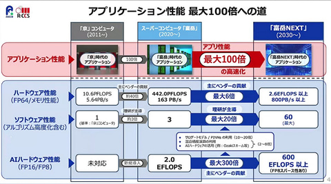 「富岳NEXT」(開発コードネーム)は、スーパーコンピュータ「富岳」の次世代となる新たなフラグシップシステムであり、理研によると、既存のHPCアプリケーションで現富岳の5~10倍以上の実効計算性能を持つほか、AI処理ではゼッタ(Zetta)スケールのピーク性能を念頭に置き、50E(エクサ)FLOPS以上の実効性能を目指している。また、シミュレーションとAIの融合により、総合的には最大100倍となるアプリケーション性能の高速化を目標にしている。