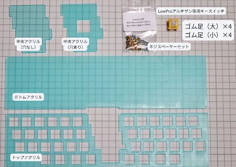 アクリルプレートは購入時に選択可能。3mm厚のハイプロファイル(ノーマルプロファイル相当)と2mm厚のロープロファイルを用意している。ただしロープロファイルはKailh choc v1キースイッチ非対応。
