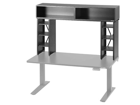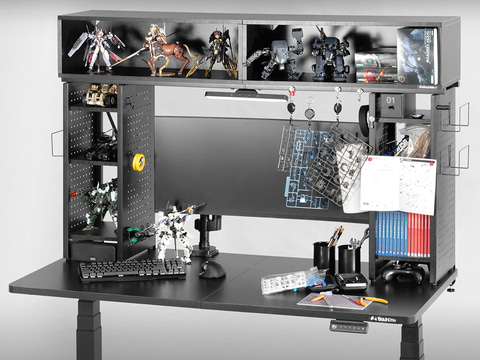 モデラーデスクラック BHS-1400MRはデスクに後付けするタイプのラック。ラック上部に67×28.5×20cmのボックス型の空間を2つ備え、デスク上のデッドスペースにフィギュアやプラモデル、工具などを飾ることができる。