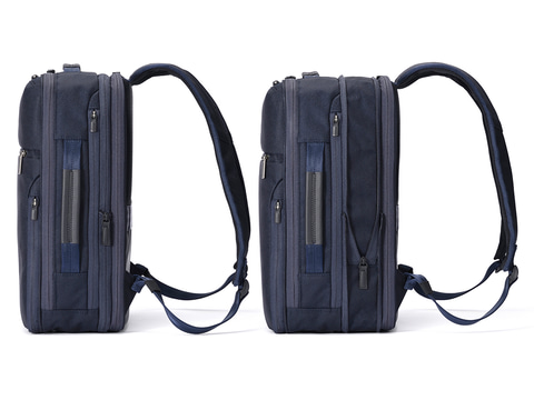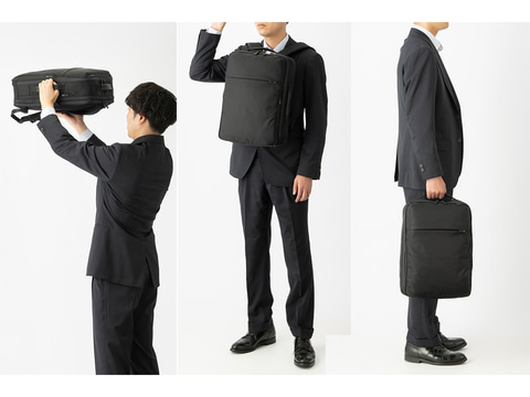 手に持つ時はトップハンドル、棚に上げる時はサイドハンドルやベルト簡易収納機能を搭載する。前に抱える時は縦/横どちら向きで抱えても取り出しやすい位置にファスナーやポケットを配置し、交通各社の推奨する複数の持ち方に対応する。