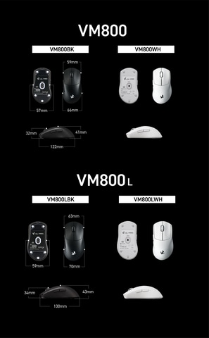 使用者の手に合わせて選べるよう、形状はVM800と「VM800L」の2種類をラインナップ、いずれもガスアシスト成形シェルによる中空構造で軽量化している。VM600からボタン配置やホイール形状の見直しにより各ボタンへのアクセス性を向上させ、かぶせ持ちとつかみ持ちに最適化したハーフエルゴ形状で高いフィット感を実現したとしている。